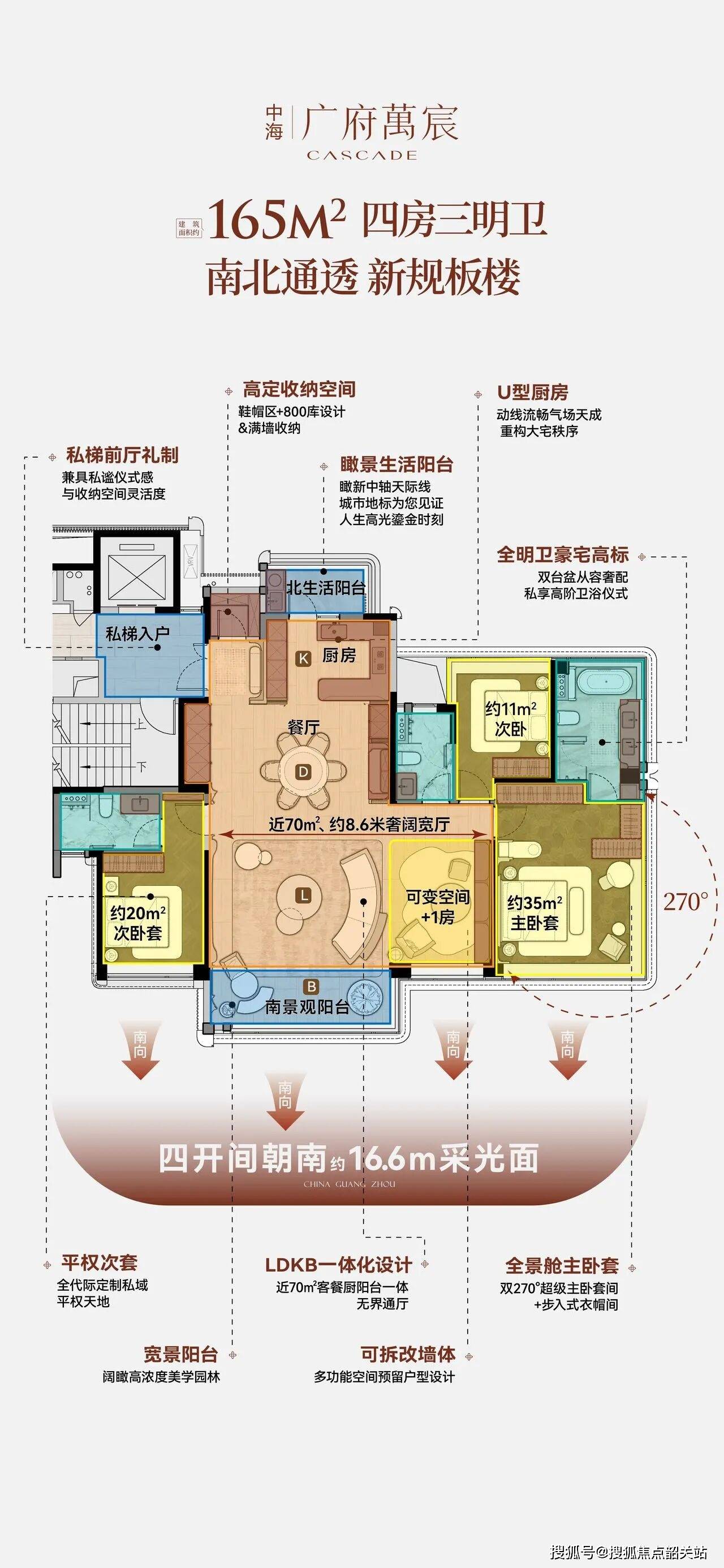 - **户型格局**:两梯两户,专梯入户,私梯厅专属使用(不计入建筑面积);纯南向设计,南北对流双阳台,全屋全明无暗室;