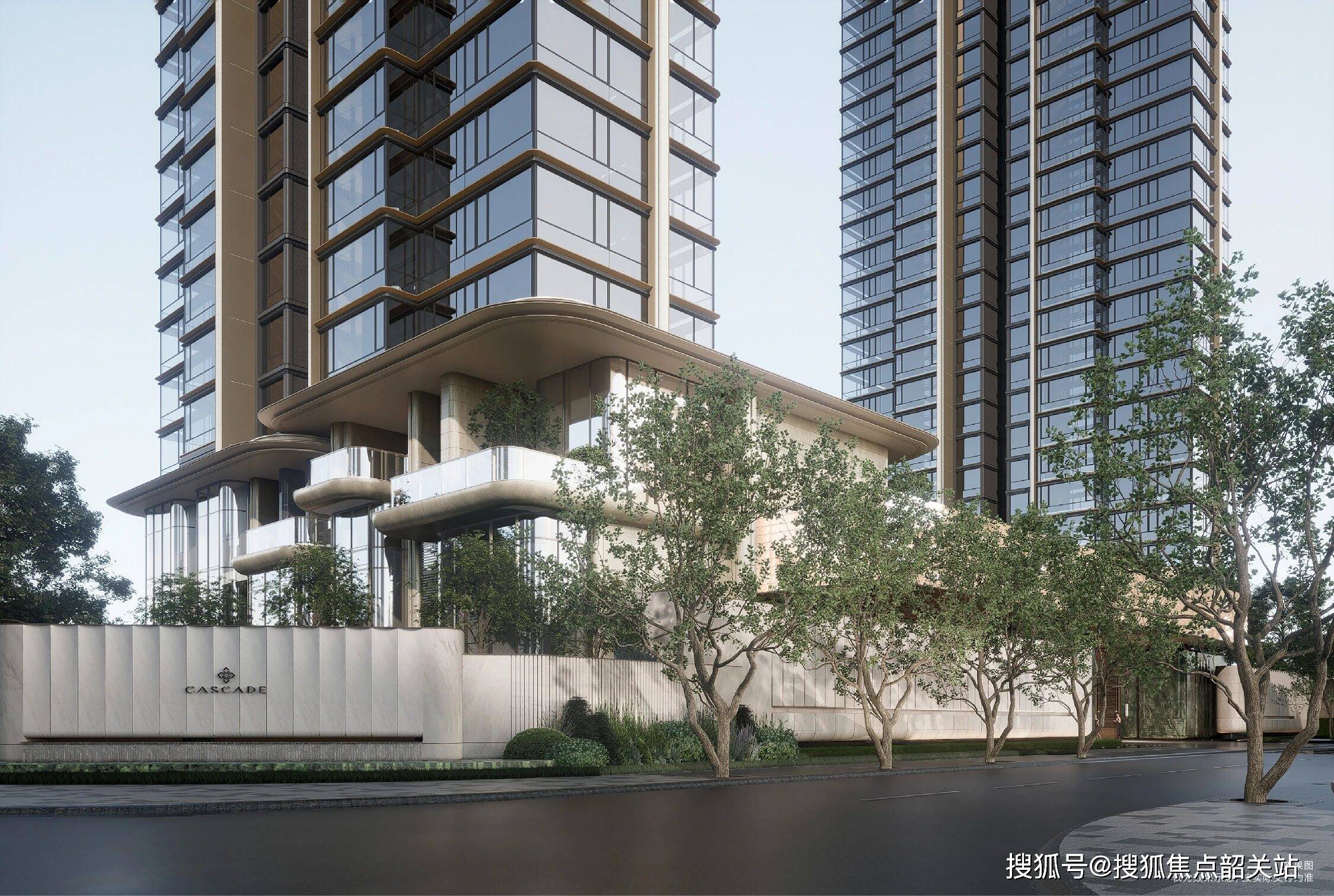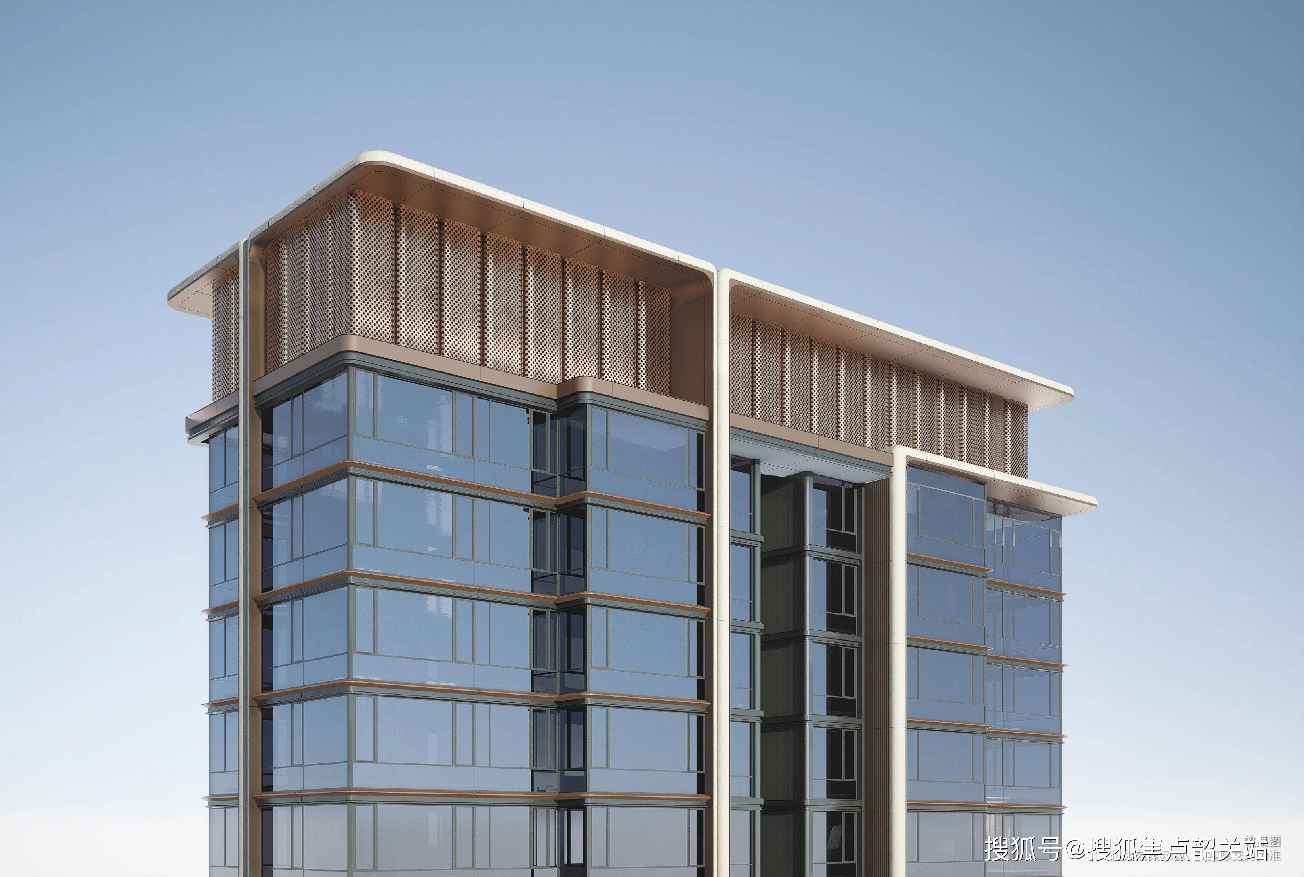 - **外立面设计**:采用**全景玻璃幕墙+精奢铝板+天然石材**组合,突破极限窗墙比(窗墙比超75%),以向上挺拔的铝板经纬线条勾勒建筑轮廓,现代简约又不失东方韵味;